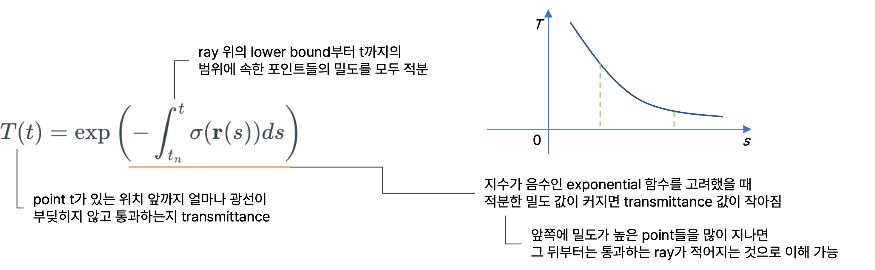 - $T(t)$: point가 있는 위치 앞까지 얼마나 광선이 부딪히지 않고 통과하는지(광선이 $t$까지 얼마만큼 도달했는지 그 비율)