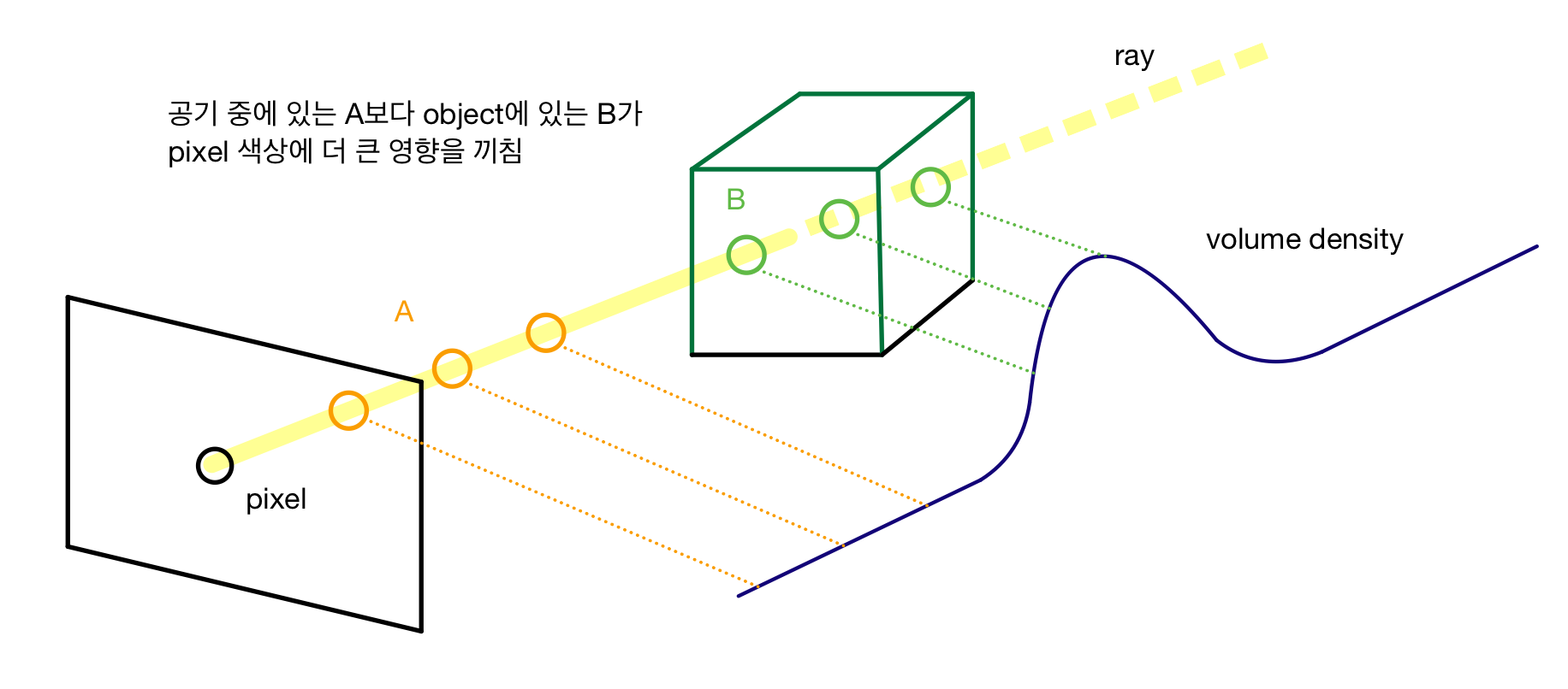 어렵게 서술되어서 그렇지만 그림과 같이 공부하면 쉽게 이해할 수 있다. 예를 들어, 다음과 같이 카메라의 핀홀을 통해 픽셀로 들어오는 ray가 있다고 가정해 보자. 그러면 ray 위의 점들에서 주황색 point들을 A, 초록색 point들을 B라고 하자. A는 공기 중에 있으므로 밀도가 낮고, B는 직육면체인 object에 있으므로 밀도가 높다. 그러면 A와 B 중 픽셀의 색을 결정하는 데 더 많은 영향을 미치는 것은 무엇일까? 바로 B이다. 밀도가 낮으면 그만큼 투명도가 높고, 반대로 밀도가 높으면 투명도가 낮아서 ray의 색에 영향을 덜 미치게 된다.