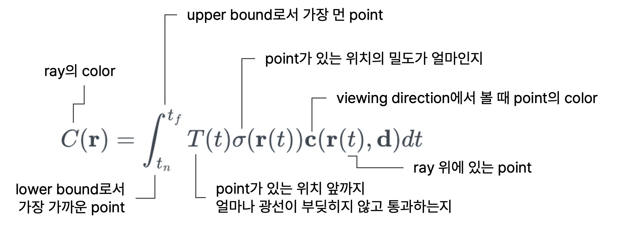 식을 그대로 완벽히 외우기보다는 식에 내재된 직관을 파악하는 것이 중요하다고 생각했다. 먼저 이 모델에서 volumetric rendering을 위한 volumetric rendering equation 식이 어떻게 정의되었는지를 이해하기 전에 그 식을 구성하는 각각의 기호가 무엇을 뜻하는지를 살펴보자.