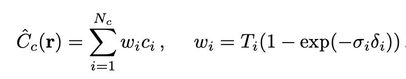 이렇게 coarse network에서 사용한 sampling 점들인 $N_c$와 fine network에서 다시 샘플링할 때 뽑은 점들인 $N_f$를 가지고 최종적인 컬러인 $\hat{C}_f(\mathbf{r})$를 렌더링 할 때 사용한다.