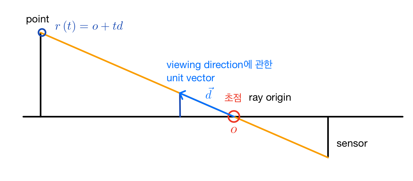 좀 더 쉬운 이해를 위해 2차원 평면 상에 그려서 나타냈지만, 3차원에서도 성립하는 내용이다. 3차원이라면 초점 $o$와 unit vector $d$는 각각 3차원 좌표와 벡터로 주어지고, $o$에서 벡터 $d$ 방향으로 $t$만큼 실수배 이동한 곳의 3차원 좌표 $(x, y, z)$가 바로 $r(t)$와 같다.