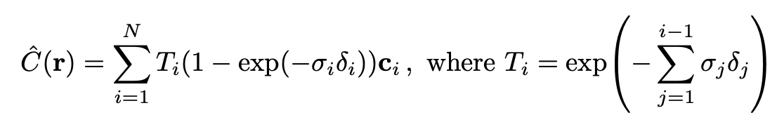 이 논문에서 volumetric rendering function은 새로운 내용을 발견하거나 떠올려서 정의한 것은 아니고, 기존에 사용하던 volume rendering 방식을 그대로 응용하여 가져온 것이다. 앞서 우리는 2D 이미지의 한 픽셀에서 나가는 ray 위의 각각 하나의 점(point)들에 관해 volume density와 color를 구했다. 이를 가지고 그 픽셀에 ray가 들어올 때 최종적으로 어떠한 색과 투명도를 보일 지를 결정하는 것이 바로 volumetric rendering이다. 이 부분을 neural network에서 학습하고자 하는 내용과 혼동하지 말아야 한다.