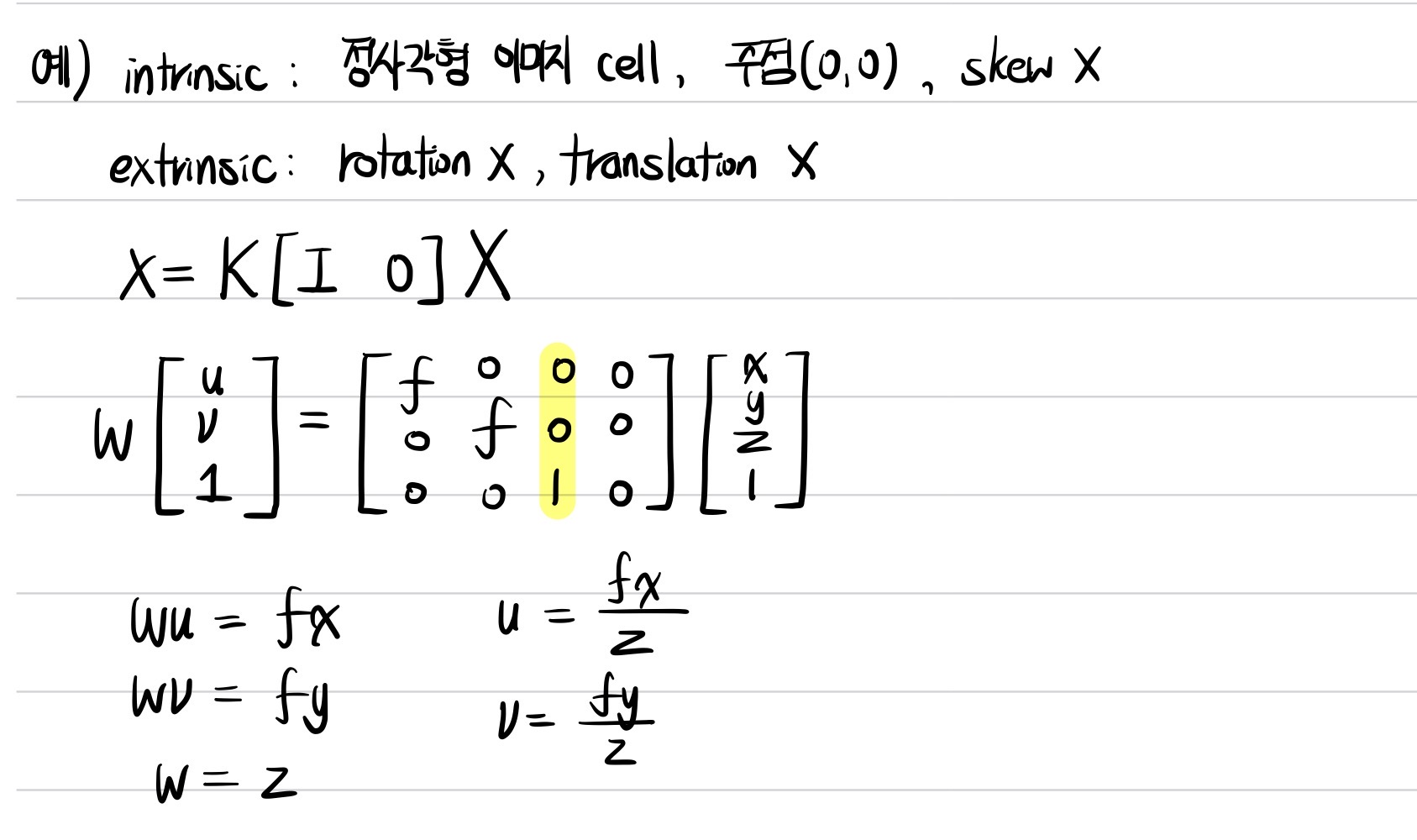 간단한 예시를 들어보자. 카메라의 이미지 센서가 정사각형이고, focal length가 cell의 가로와 세로 방향 크기 각각 모두 $f$배이며, 주점은 이미지 센서의 cell array가 한쪽 방향으로 기울어지지 않았다고 하자. 또한 카메라 설치에 관해 rotation과 translation 모두 발생하지 않았다고 가정하자. 그러면 이미지 좌표계와 3차원 좌표계를 서로 변환할 수 있는 식은 위와 같이 구할 수 있다.