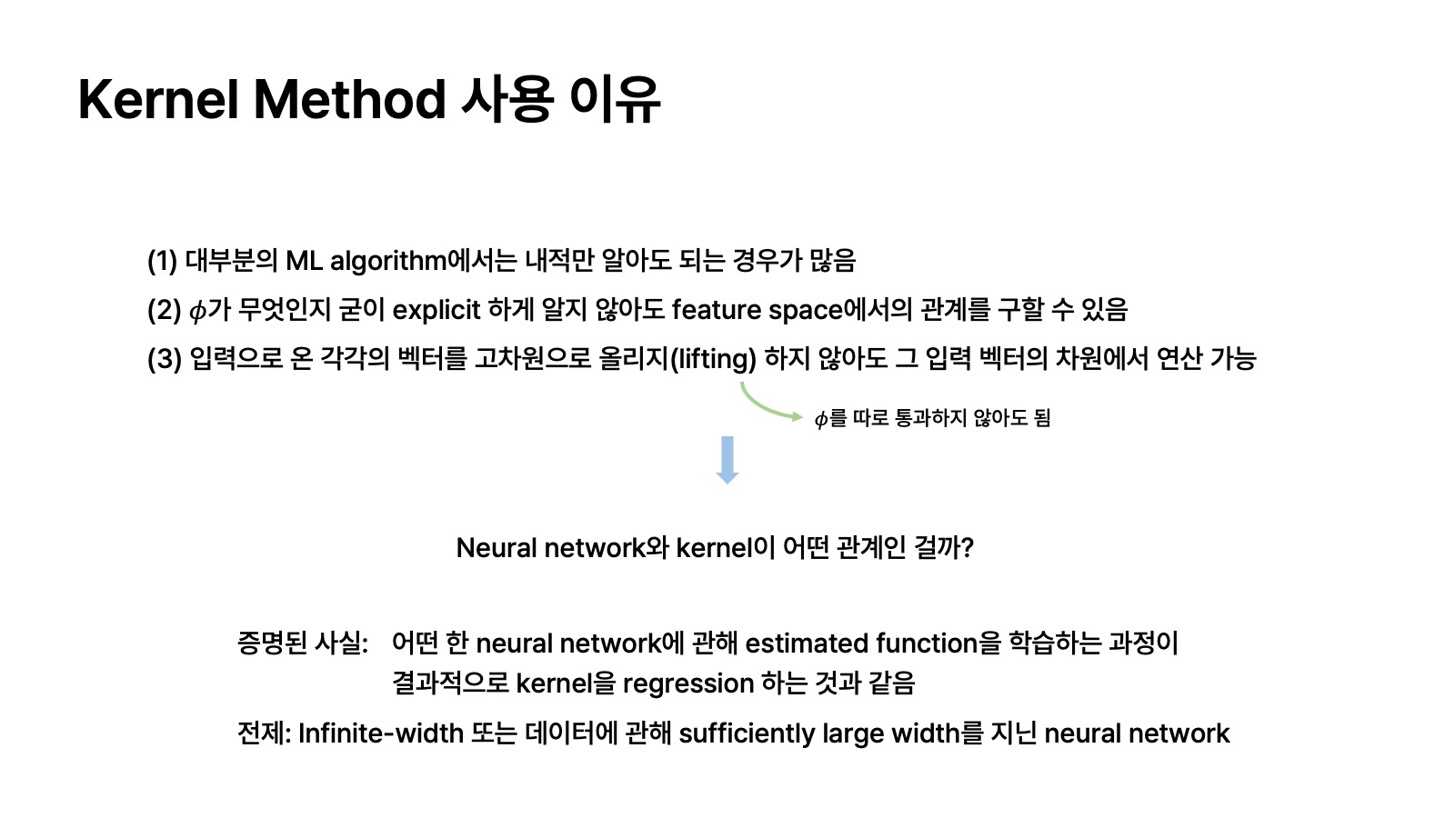 그런데 여기서 의문이 드는 게, 도대체 neural network와 kernel이 어떠한 관계에 있기에 Neural Tangent Kernel이라는 말이 나왔냐는 것이다. 이에 관해서는 한 가지 짚고 넘어가야 할 점이 있는데, 바로 어떤 한 neural network에 관해 estimated function을 학습하는 과정은 결과적으로 kernel regression과 같다는 것이다. 단, 전제는 그 neural network가 infinite-width 또는 데이터에 관해 sufficiently large width를 지니고 있어야 한다는 것이다. 이러한 사실을 어떻게 받아들일 수 있는지는 다음 글에서 Neural Tangent Kernel을 설명하면서 이어가고자 한다.