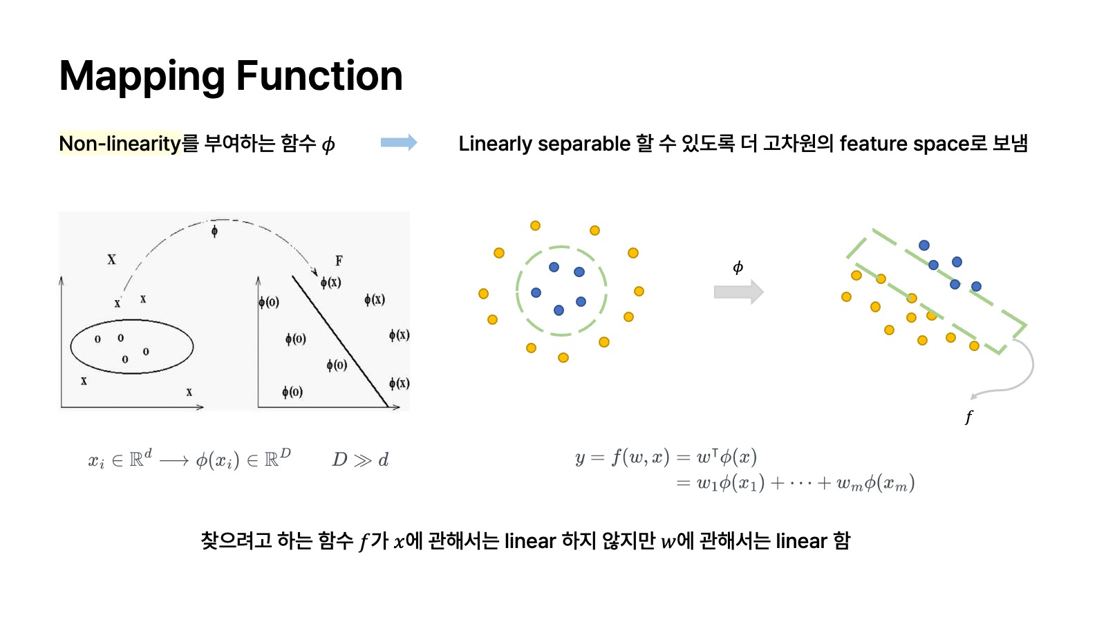 데이터를 고차원으로 mapping 시켜서 non-linearity를 부여할 수 있도록 해야 하는데, 그러한 함수를 mapping function이라고 부르고, 여기서는 $\phi$라고 적겠다. Non-linearity를 부여하는 함수 $\phi$를 통해 저차원의 데이터를 linearly separable 할 수 있도록 더 고차원의 feature space로 보내는 것이다. Mapping function을 데이터에 적용한 후 함수 $f$를 작성하면 다음과 같다.