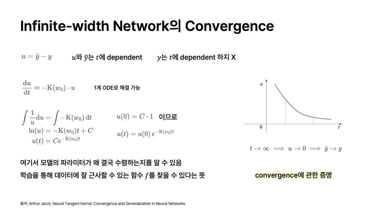 여기서 모델의 파라미터가 실제 데이터에 근사하게끔 수렴하는지를 알 수 있다. 즉, 학습을 통해 데이터에 잘 근사할 수 있는 함수 $f$를 찾을 수 있다는 뜻이다. 이 부분이 이해가 잘 안 간다면 위의 $e^{-K(w_0)t}$에 관한 지수 함수 그래프를 참고해 보면 된다. $t$가 무한대에 가까워질수록 $u$는 0으로 수렴하고, 이는 결국 $\hat{y}$가 $y$로 수렴한다는 걸 의미한다.