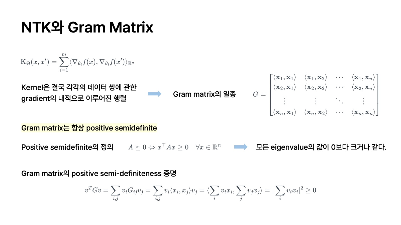 그런데 Gram matrix에 해당되는 NTK는 positive semeidefinite이 아니라 항상 positive definite 하다는 특성을 지니고 있다. 여기서 positive definite의 정의를 써 보면 아래와 같다.