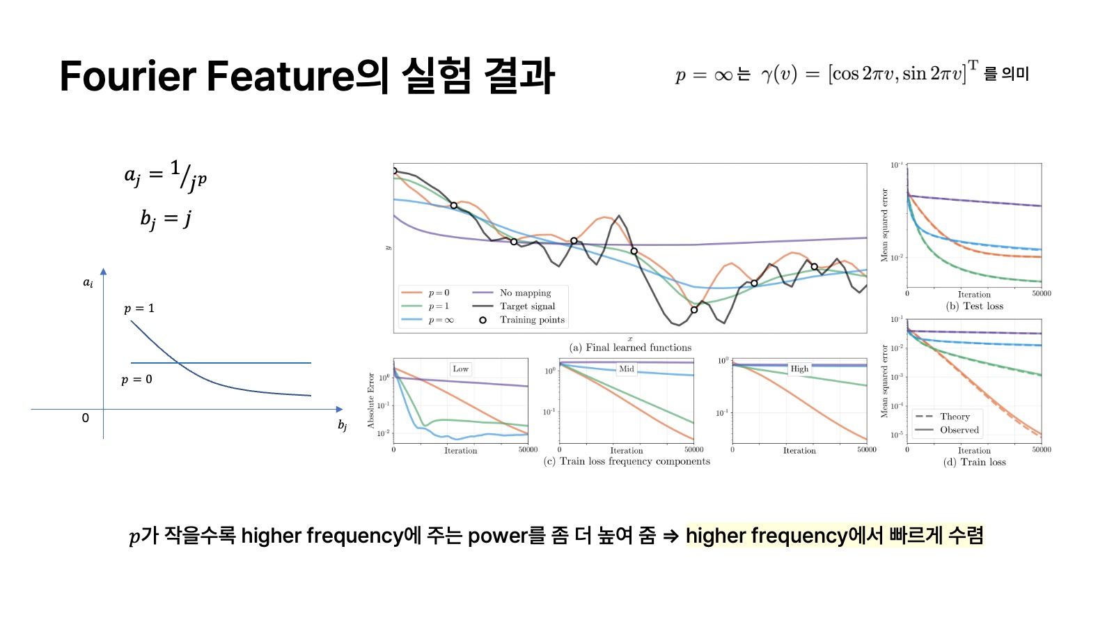 위의 실험 결과는 Fourier feature가 모델이 high frequency 데이터를 좀 더 잘 학습할 수 있다는 점을 보여준다. 여기서 $p$가 작을수록 주파수 $\mathbf{b}$는 커지고 그 진폭 $\mathbf{a}$도 커지므로 결과적으로 higher frequency에 주는 power를 높여주게 된다. 그래서 모델이 high frequency에서도 빠르게 수렴할 수 있다는 사실을 보여주고 있다.