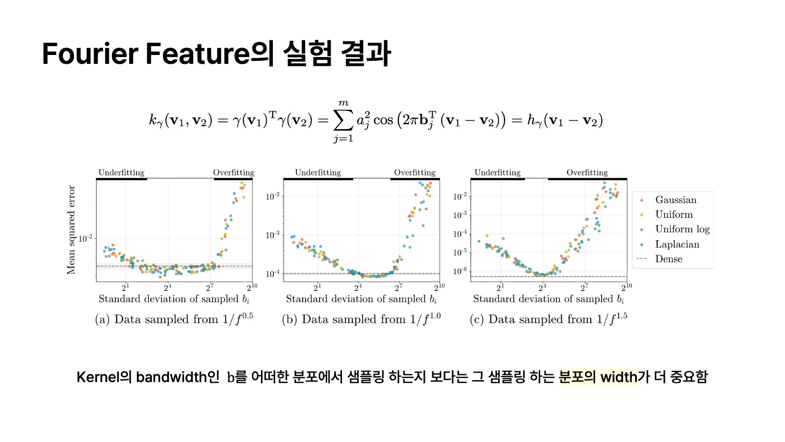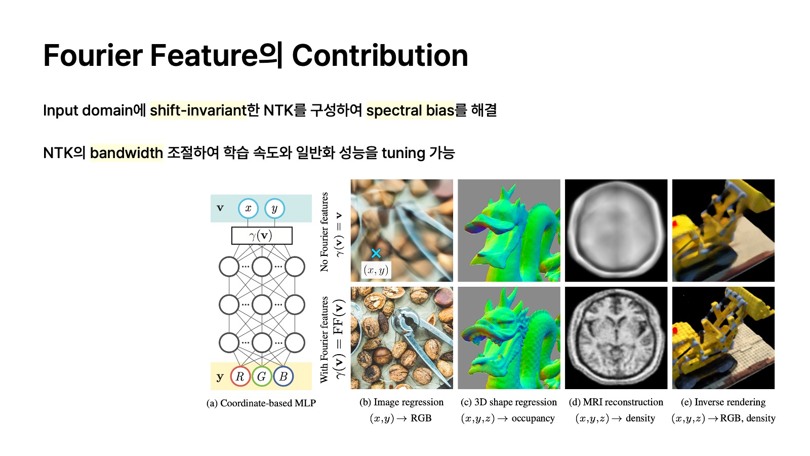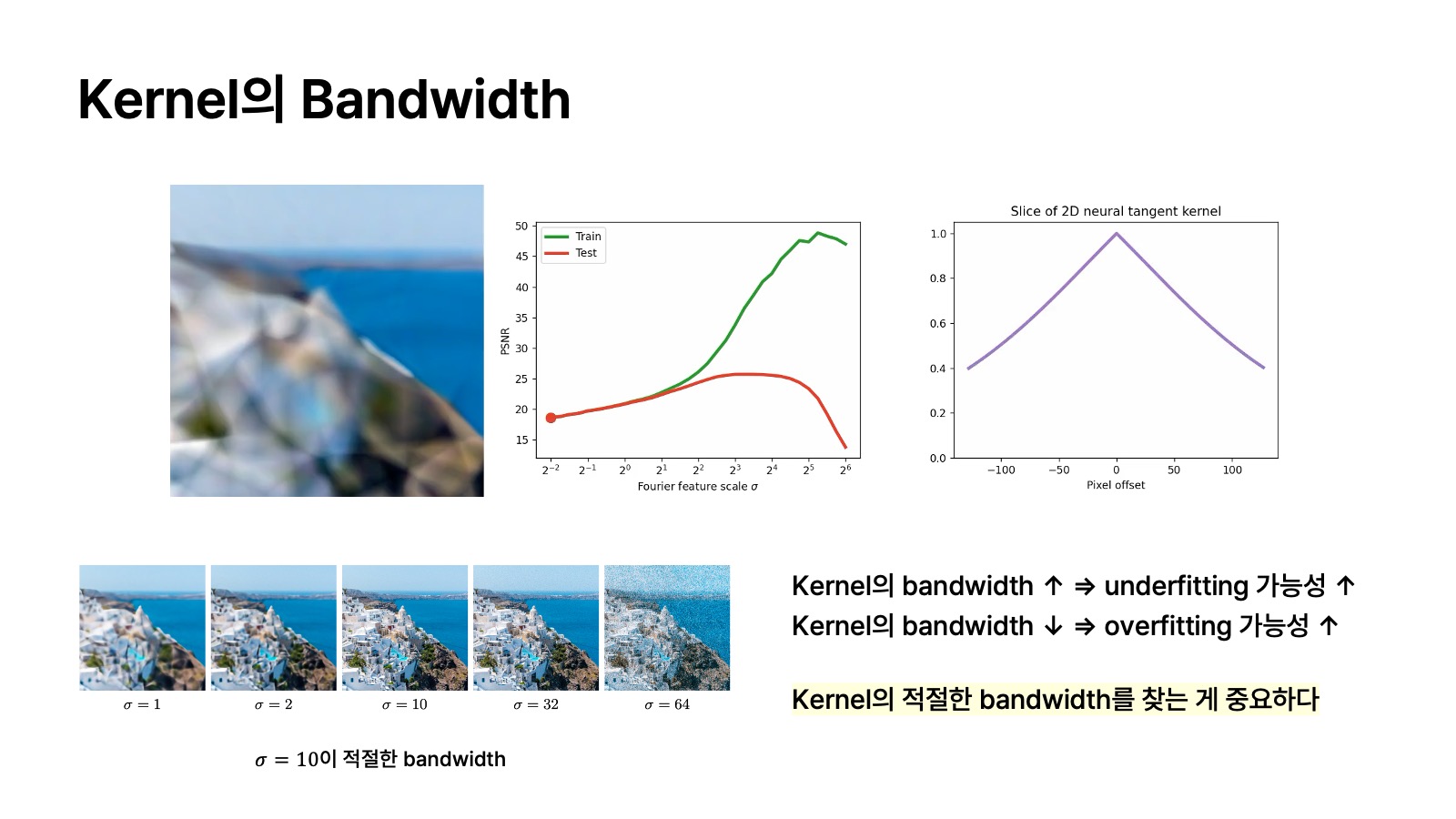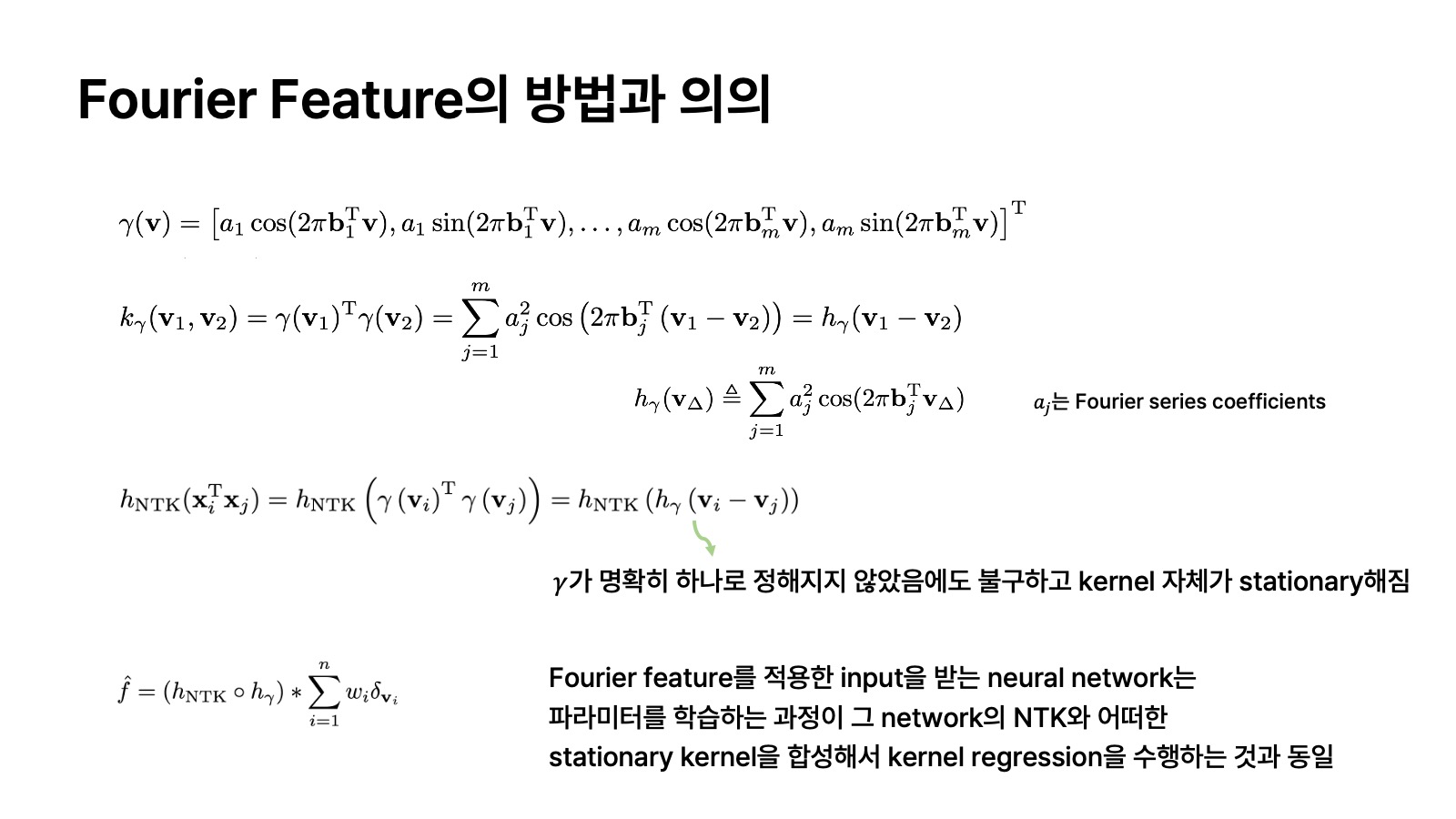 두 번째는 NTK도 결국 kernel인데, kernel regression을 수행하는 과정에서 bandwidth가 중요하다. 일반적으로 network에서 NTK의 bandwidth를 조절하는 것은 어려운데, Fourier feature를 사용하면 kernel의 bandwidth에 대한 control이 쉬워진다. 이도 뒤에서 kernel function 식을 정리하면서 알아볼 예정이다.