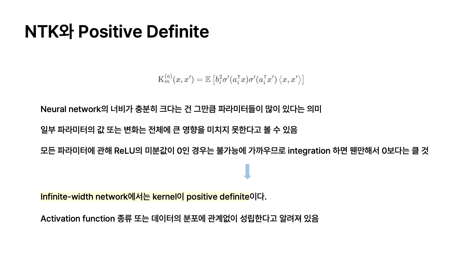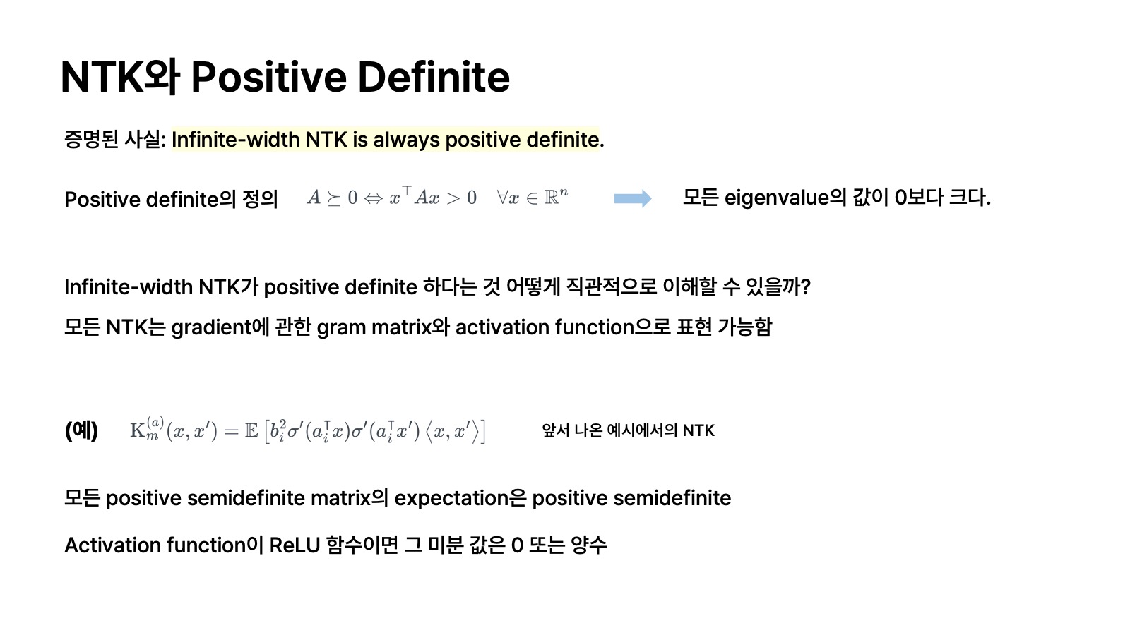 이 neural network는 infinite-width를 지니고 있다고 가정했는데, neural network의 너비가 충분히 크다는 건 그만큼 파라미터들이 네트워크에 많이 있다는 것을 뜻한다. 그러므로 일부 파라미터의 값이 변화하는 것만으로는 네트워크 전체에 큰 영향을 미치지 못한다고 볼 수 있다. 그런데 그 수많은 파라미터에 관하여 ReLU의 미분값이 0인 경우는 불가능에 가까우므로 integration해서 expectation을 구하면 웬만해서 0보다는 클 것이라고 예상할 수 있다. 그래서 직관적으로 infinite-width network에서는 NTK가 positive definite이다. 이는 activation function 종류 또는 데이터의 분포에 관계없이 성립한다고 알려져 있다.