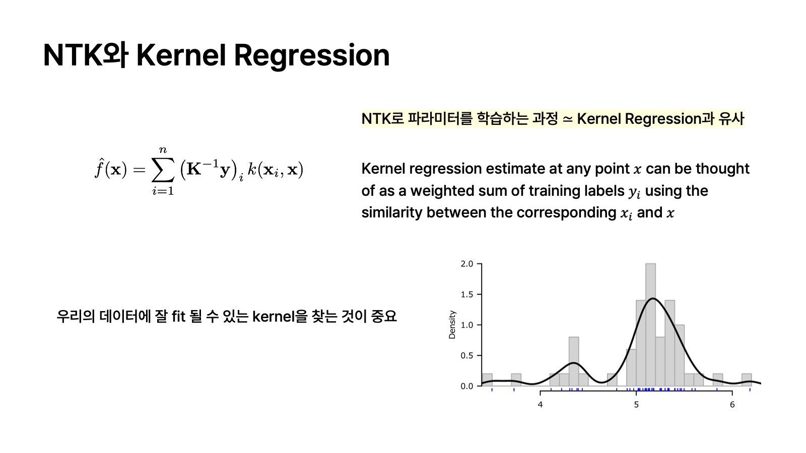 앞서 NTK로 network의 파라미터를 학습하는 과정은 kernel regression과 유사하다고 정리했다. 그런데 여기서 어떤 데이터 포인트 $x$에 관한 $y$를 예측하는 kernel regression을 수행하는 것은 $x$와 다른 데이터 $x_i$ 간의 유사도를 계산하기 위해 그 데이터 $x_i$에 대응되는 $y_i$의 가중합을 구하는 과정으로 이해할 수 있다. 그래서 데이터에 잘 적합될 수 있는 가중합으로서의 kernel을 찾는 것이 중요하다.
