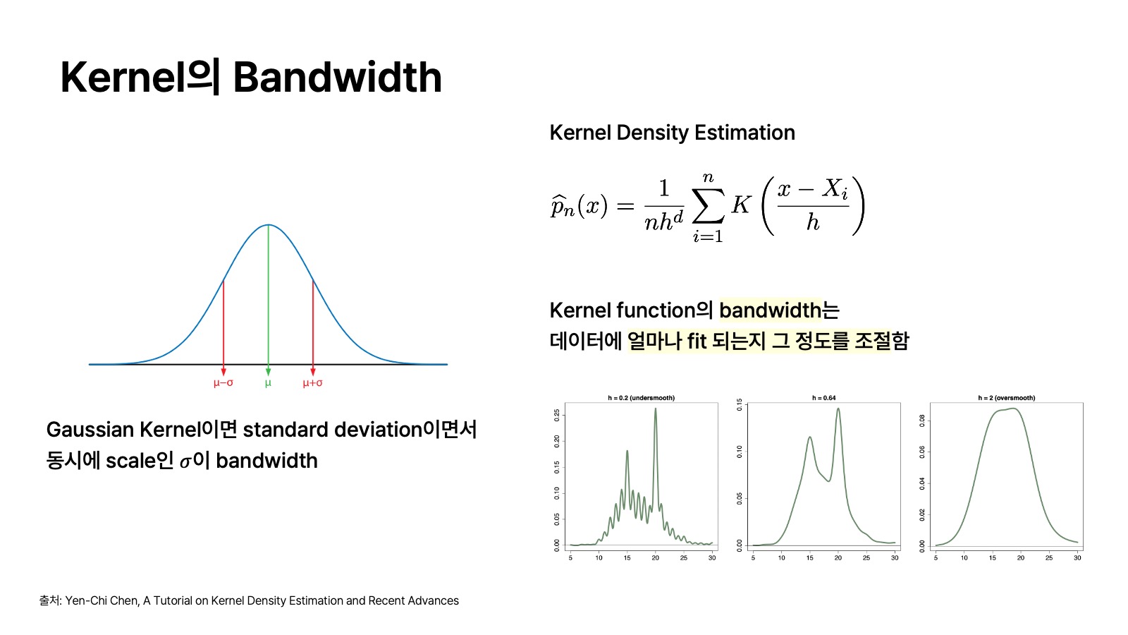 위의 그림에서 왼쪽 위의 정규분포 그래프를 확인해 보자. 만약에 kernel이 gaussian kernel이라고 가정하면 그 gaussian 분포의 standard deviation이면서 동시에 scale이라고 불리는 $\sigma$가 kernel의 bandwidth이다.
