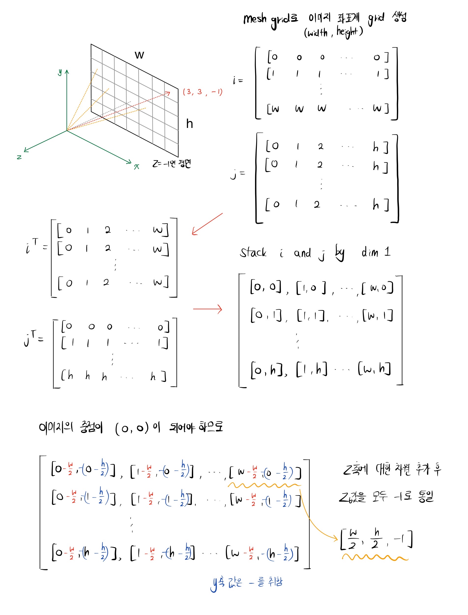 그런데 width는 오른쪽 방향으로 늘어나야 하고 height는 아래 방향으로 늘어나야 하므로 transpose를 취한다. 이후 stack을 사용하여 $x$축 좌표 값과 $y$축 좌표 값을 $z$축 좌표 값인 -1과 같은 차원의 원소로 묶는다. 여기서 주의할 점은 $y$축은 위의 방향으로 증가하므로 그전에 아래 방향으로 증가하는 $y$축 좌표 값에 -1을 곱해서 $y$축의 증가 방향과 일치하도록 한다. 위의 그림에서 설명한 과정을 따라가 보면 이해하기 쉽다.