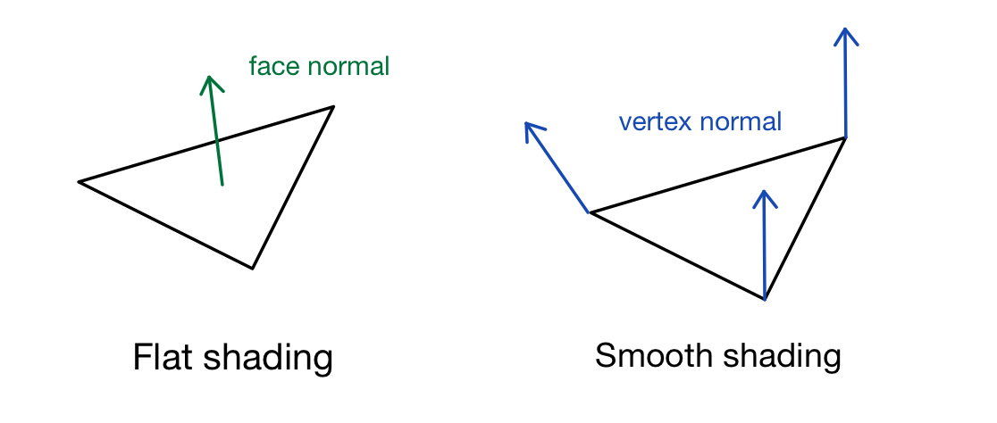 Flat shading은 polygon 당 하나의 face normal을 구하는 방식이고, smooth shading은 vertex normal을 사용하여 각 픽셀별로 색을 계산하는 방법이다. Flat shading은 polygon마다 그 안에 속해 있는 모든 픽셀의 색을 한 번에 계산하므로 계산량은 적을 수 있지만, 실제와 동떨어지거나 섬세한 색상 표현은 어려울 수 있다. 반면에 smooth shading은 모든 각 픽셀마다 색을 계산하므로 연산량은 증가할 수 밖에 없다.