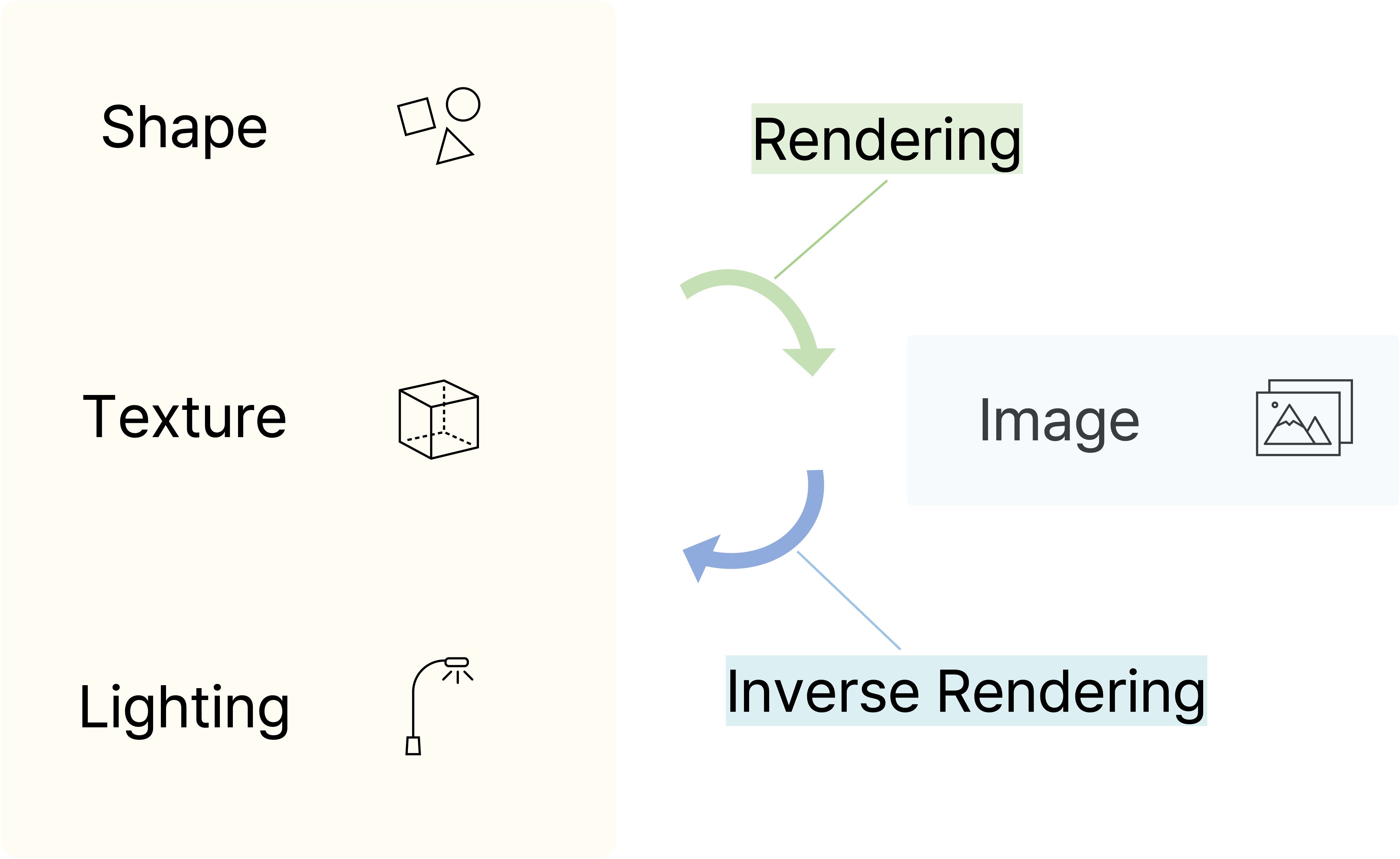 특히 3D 렌더링에서는 임의로 주어진 3D object와 scene에 관한 정보를 input으로 받아서 이를 2D 이미지의 output으로 내보내는 함수를 찾는 것이다. 반면에 2D 이미지를 input으로 받아 이에 대응되는 3D object와 scene을 output으로 구하는 과정은 inverse rendering으로 볼 수 있는데, 다시 말해 2D 이미지를 가지고 3D object와 scene의 정보와 같은 속성들을 추정하는 건 inverse rendering의 목표이다.