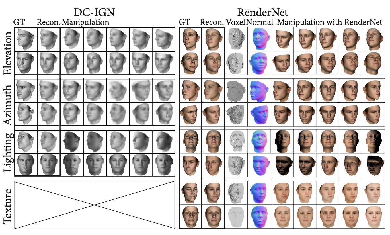 이는 DC-IGN과 RenderNet에 관해 사람 얼굴 단일 이미지를 가지고 shape reconstruction을 수행한 결과를 보면 알 수 있다. DC-IGN에서는 texture를 네트워크에서 학습하지 못하므로 격자로 제외했다.