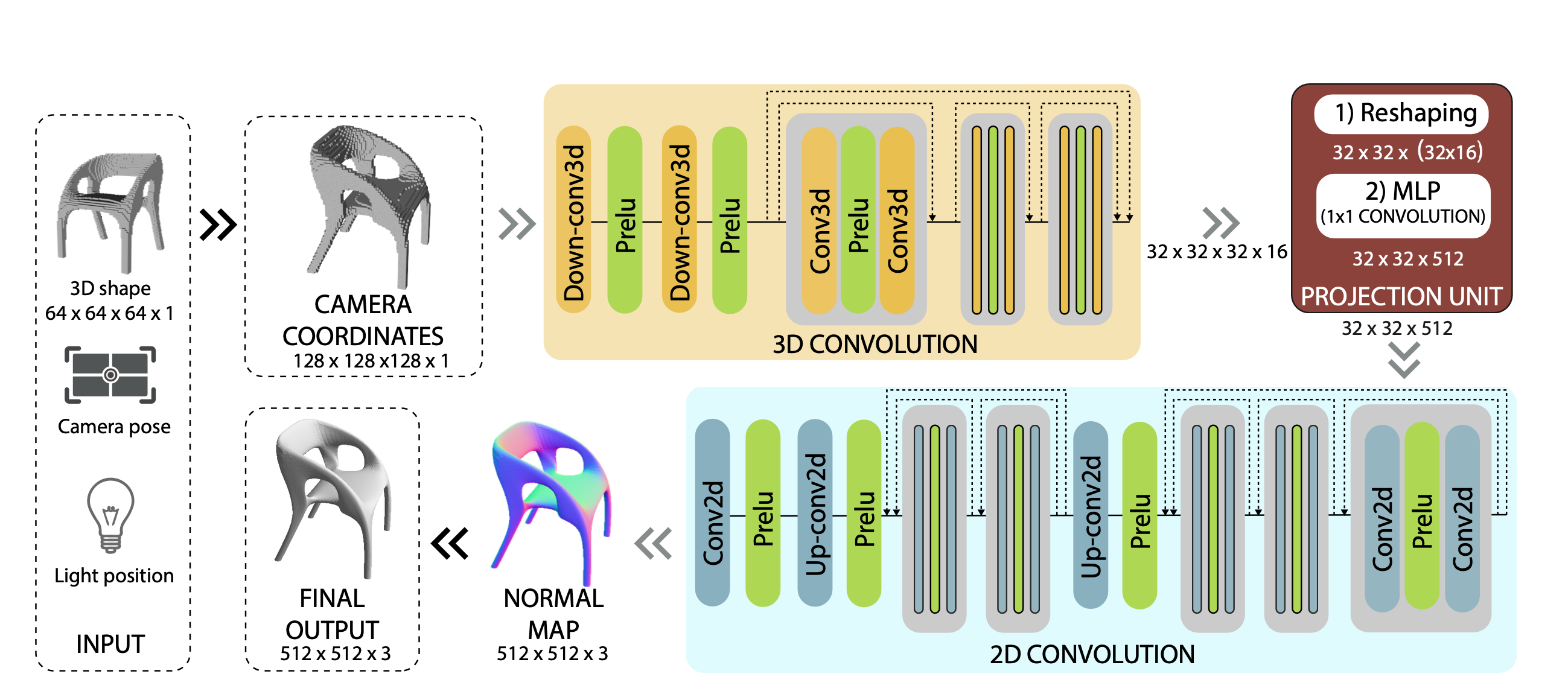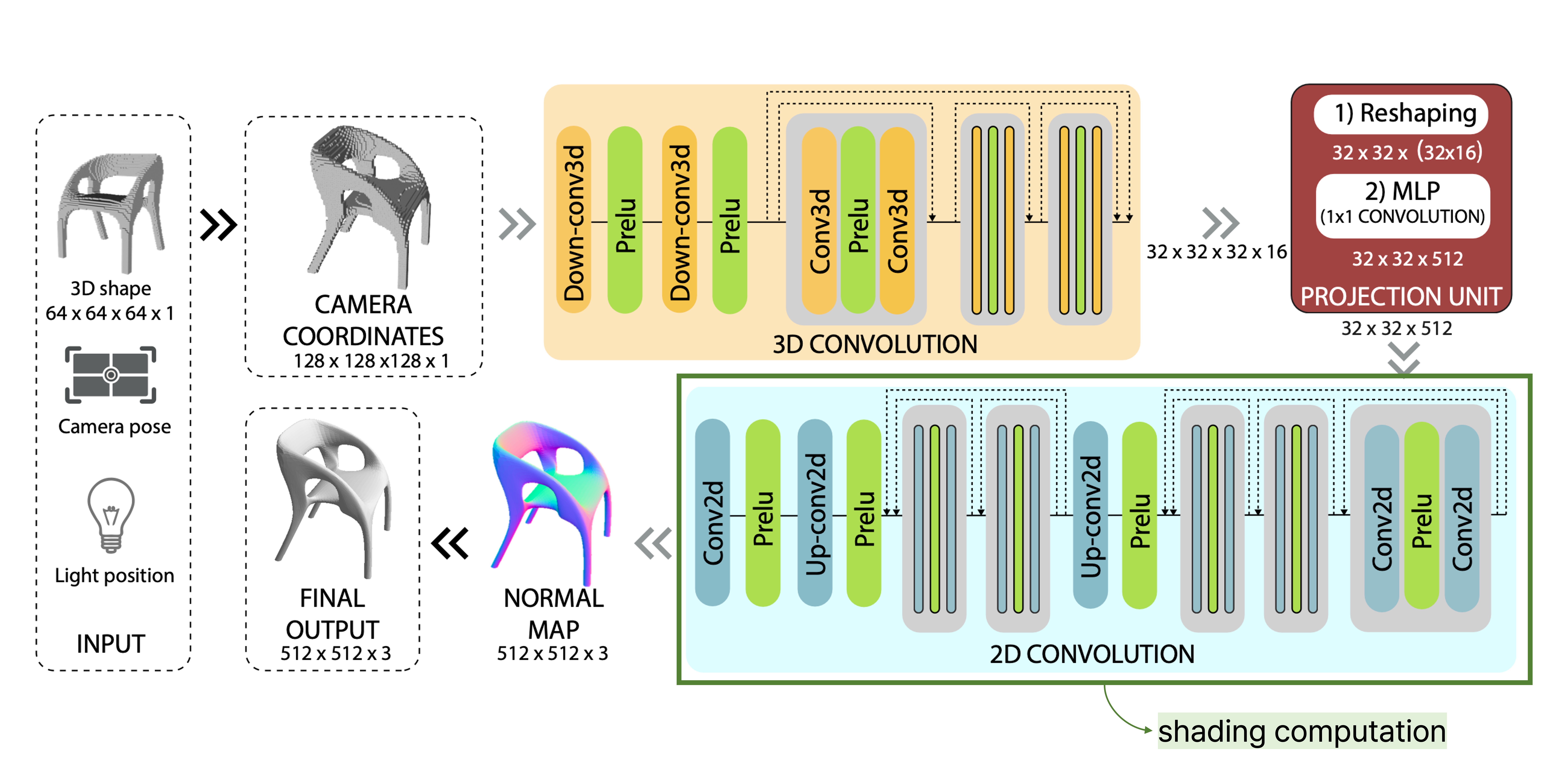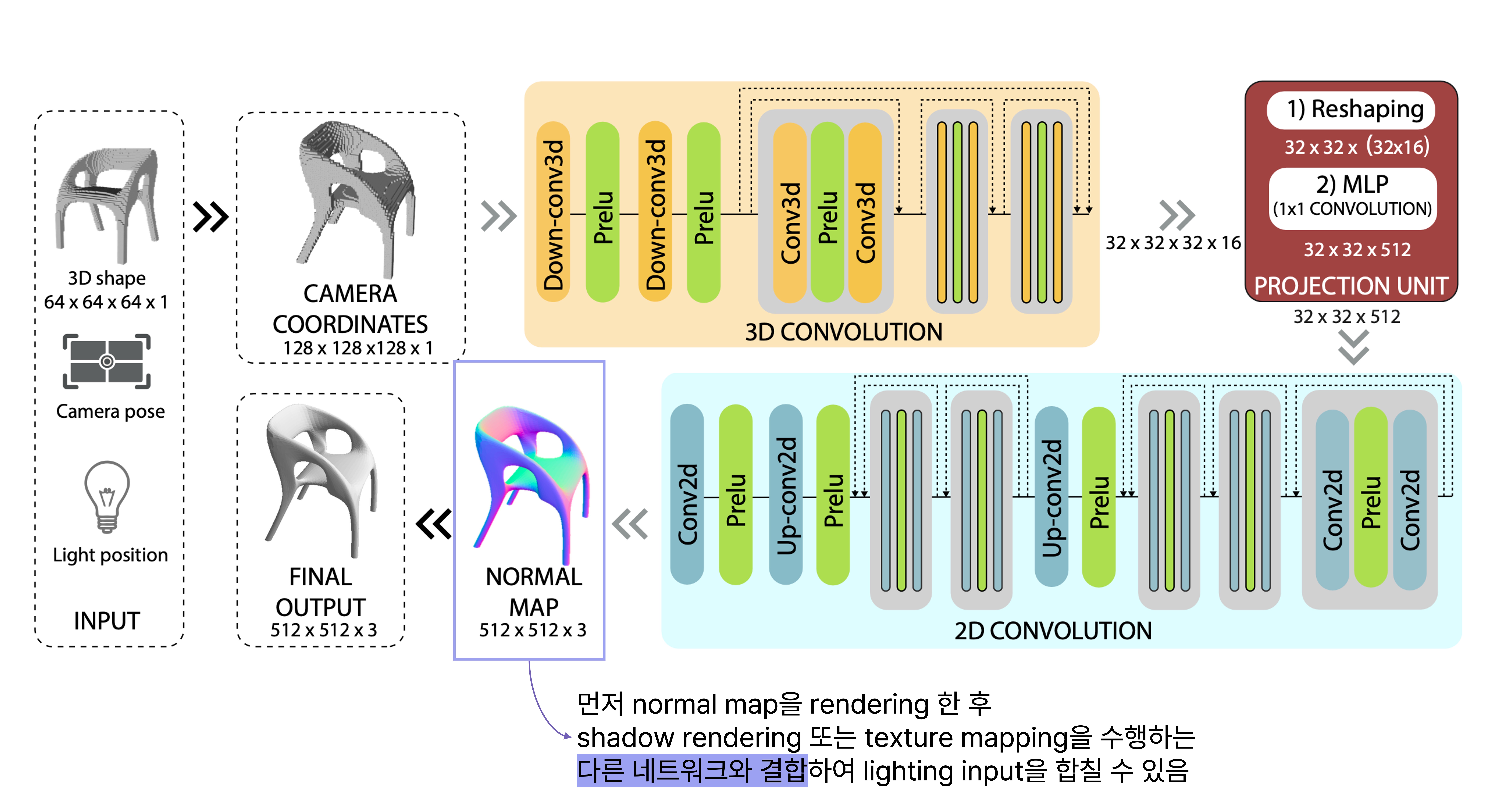 이후 projection unit의 output을 2D convolution 레이어 모듈의 input으로 넣는데, 이 2D convolution 모듈에서는 2D 이미지의 shading을 연산하는 과정을 수행한다. 이를 통과한 output은 크기 3의 channel을 갖는 $512 \times 512 \times 3$의 normal map이다.