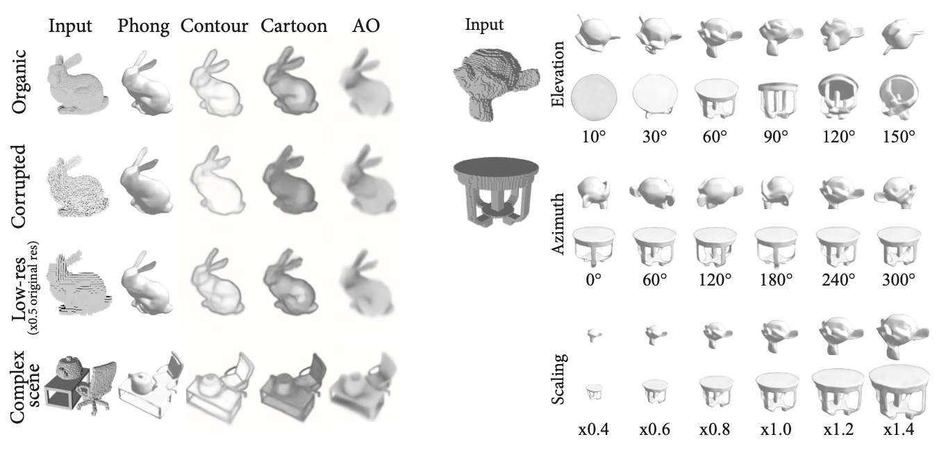 위의 figure에서 왼쪽의 토끼 모양의 grid 입력에 shader를 적용한 실험 결과가 이를 뒷받침해주며, 오른쪽의 원숭이 grid 입력을 다양한 각도에서 바라봤을 때 어떻게 보여질지를 렌더링하는 결과도 꽤 그럴 듯하게 나온 것을 볼 수 있다.