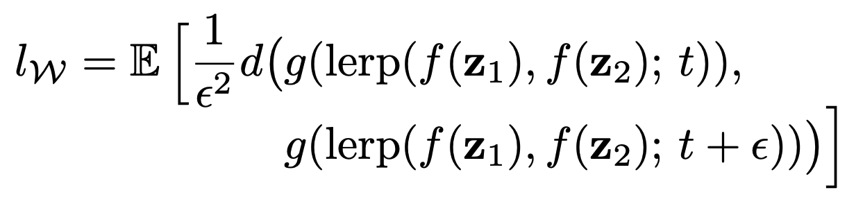 이를 intermediate latent space인 $\mathcal{W}$에 관해 계산한 식이 바로 위의 식이다. $\mathcal{Z}$에서 $\mathbf{z}_1$과 $\mathbf{z}_2$를 샘플링하는 것은 동일한데, 대신 $\mathcal{Z}$에서 보간하지 않고 이를 mapping network $f$에 통과하여 $f(\mathbf{z}_1)$와 $ㄹ(\mathbf{z}_1)$를 얻고, 어떠한 샘플링 분포의 가정이 존재하지 않아 두 벡터가 정규화되지 않았으므로 그 $\mathcal{W}$ 공간 위에서 $t$에 관해 slerp 대신 lerp(linear interpolation)을 수행한다. 그 보간 지점에 관해 synthesis network에 입력으로 넣어서 어떤 한 이미지를 생성한다. 마찬가지로 전체 과정을 $t + \epsilon$ 보간 지점에 관해 이미지를 생성하여 그 VGG embedding 거리 차이를 구하는 것은 위에서와 동일하다.
