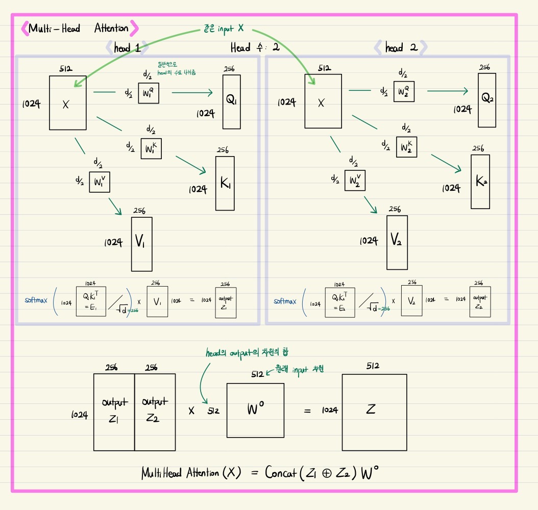 위의 그림에서는 정확히 표현되지 않았으나 'Attention is All You Need' 논문에서는 각 단어의 임베딩 벡터의 차원을 512로 하고 8개의 attention head를 사용했는데, 주목할 점은 query, key, value 행렬인 $Q_i$, $K_i$, $V_i$의 각 행 벡터의 차원 크기가 512를 8로 나눈 64를 갖도록 했다.