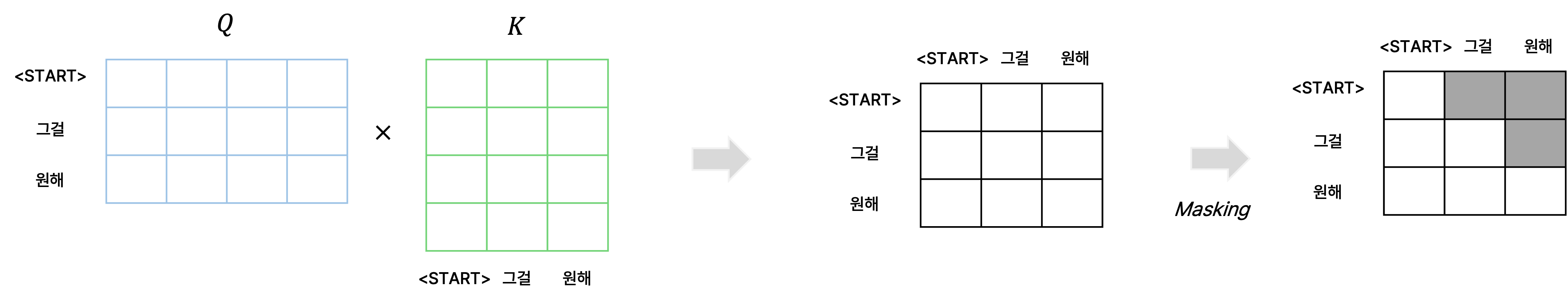 - 앞에 등장한 단어의 인코딩된 벡터가 뒤에 등장하는 단어의 정보를 반영하지 못하도록 query와 key vector의 연산 결과에서 뒤에 등장하는 단어 쌍으로 나온 attention score는 0으로 만드는 과정이 포함된다.