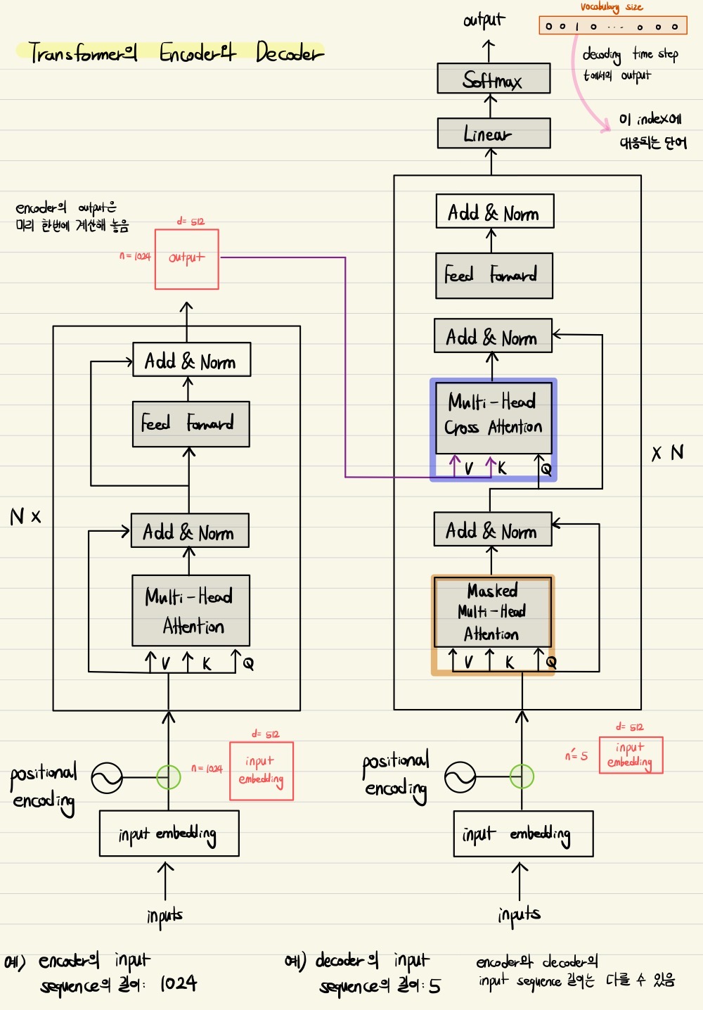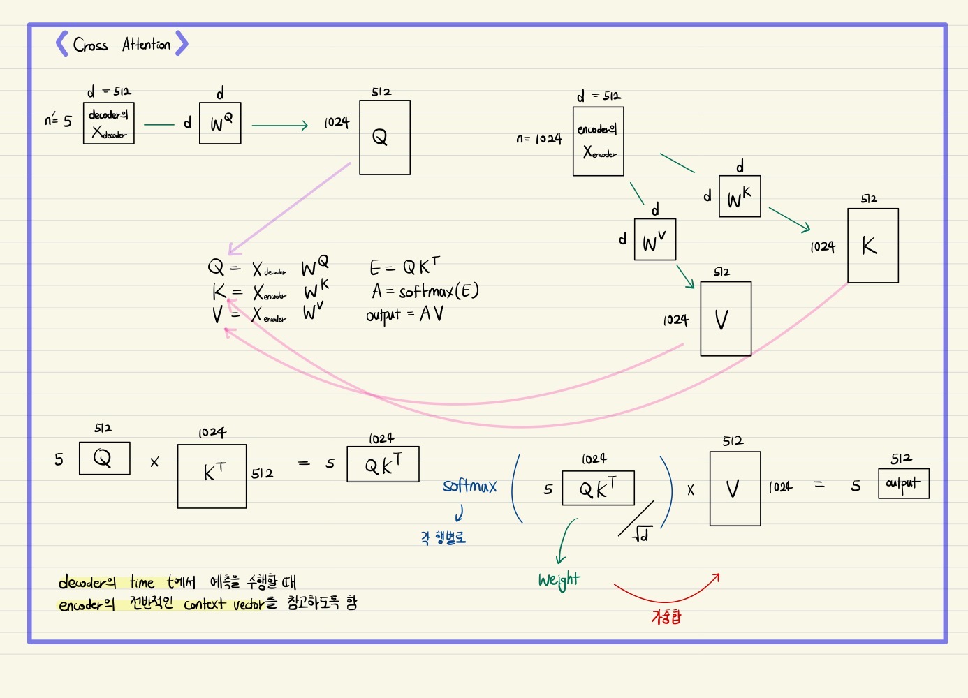 - Encoder의 output으로는 input의 각 단어에 관한 context vector를 얻는 것이며, 이들은 decoder의 multi-head cross attention에서 key와 value vector로 사용된다.