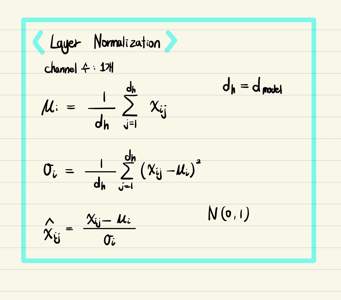 - Layer normalization: 하나의 instance의 feature에 관해 모든 channel에 대하여 해당 instance feature vector 그 자체에 정규화를 수행하는 것