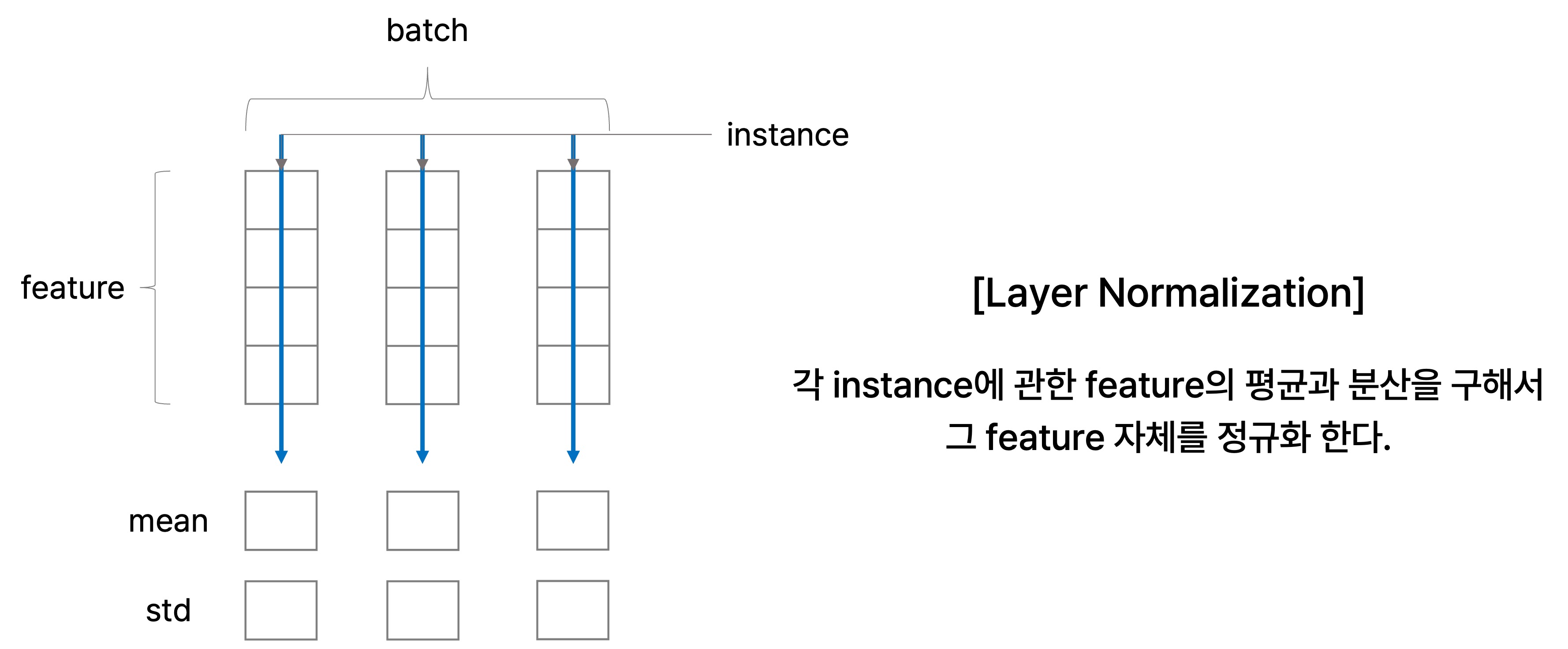 - Layer normalization: 하나의 instance의 feature에 관해 모든 channel에 대하여 해당 instance feature vector 그 자체에 정규화를 수행하는 것