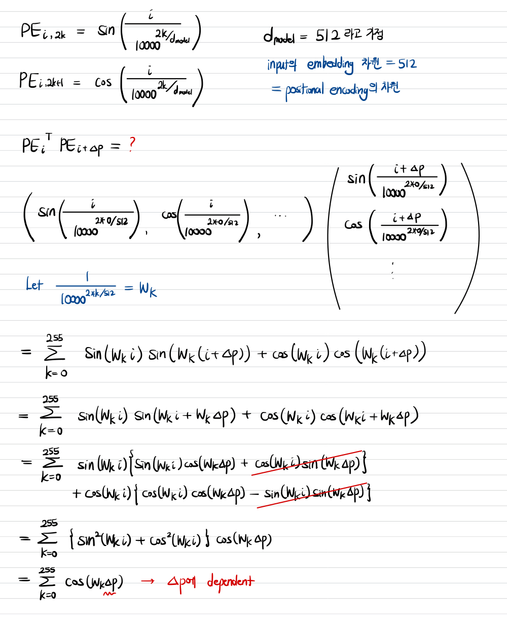 아래는 이처럼 positional encoding을 수행했을 때 임의의 위치 $i$에 관해 positional encoding $\text{PE}_i$와 $\text{PE}_{i + \Delta p}$를 dot-product 할 때의 similarity가 오로지 $\Delta p$에 의존할 수 있게 된다는 걸 증명하고 있다.