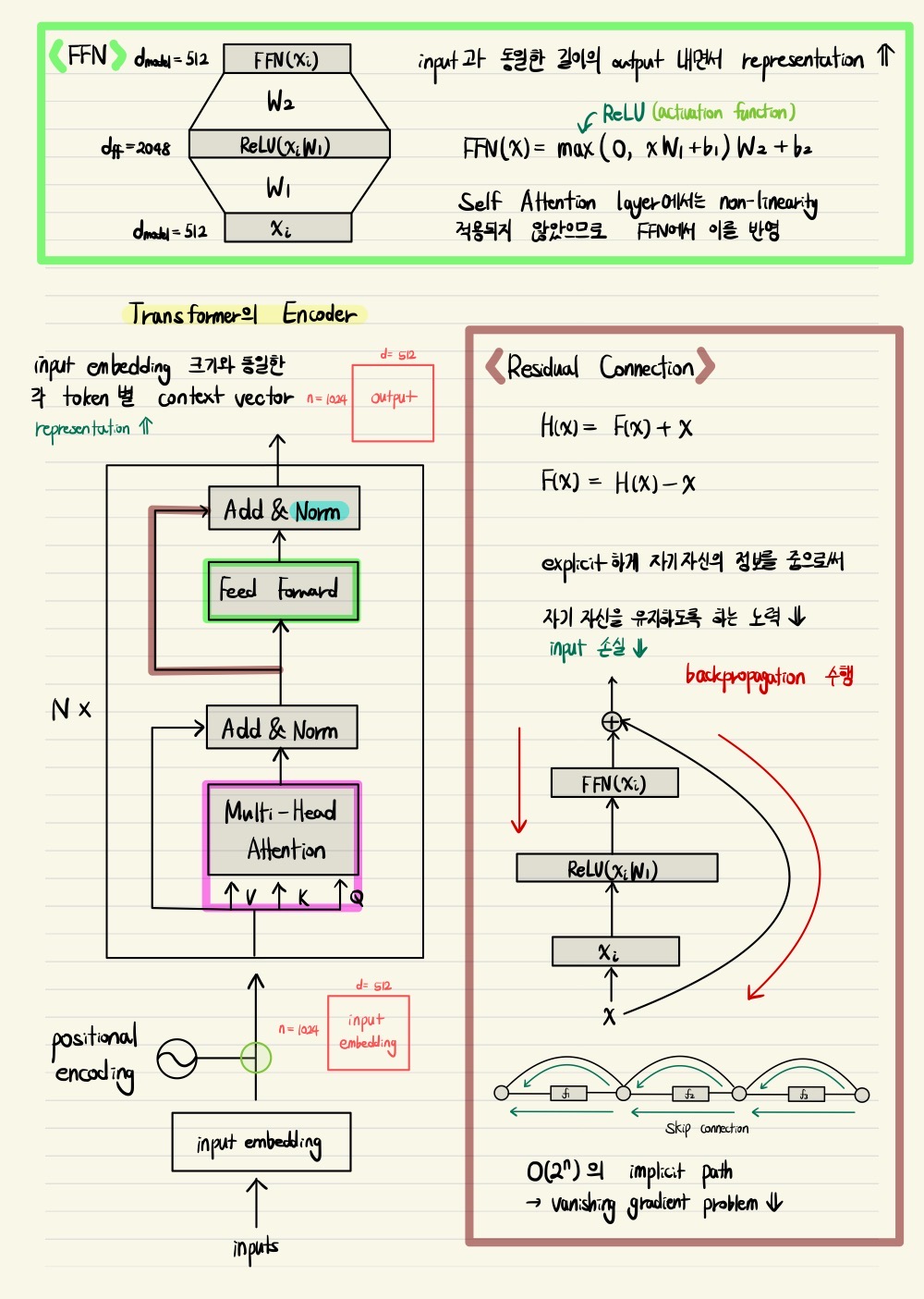 - Residual connection을 통해 입력 벡터와 Multi-Head Attention의 최종 출력 인코딩 벡터를 더하고, layer normalization을 적용한다.