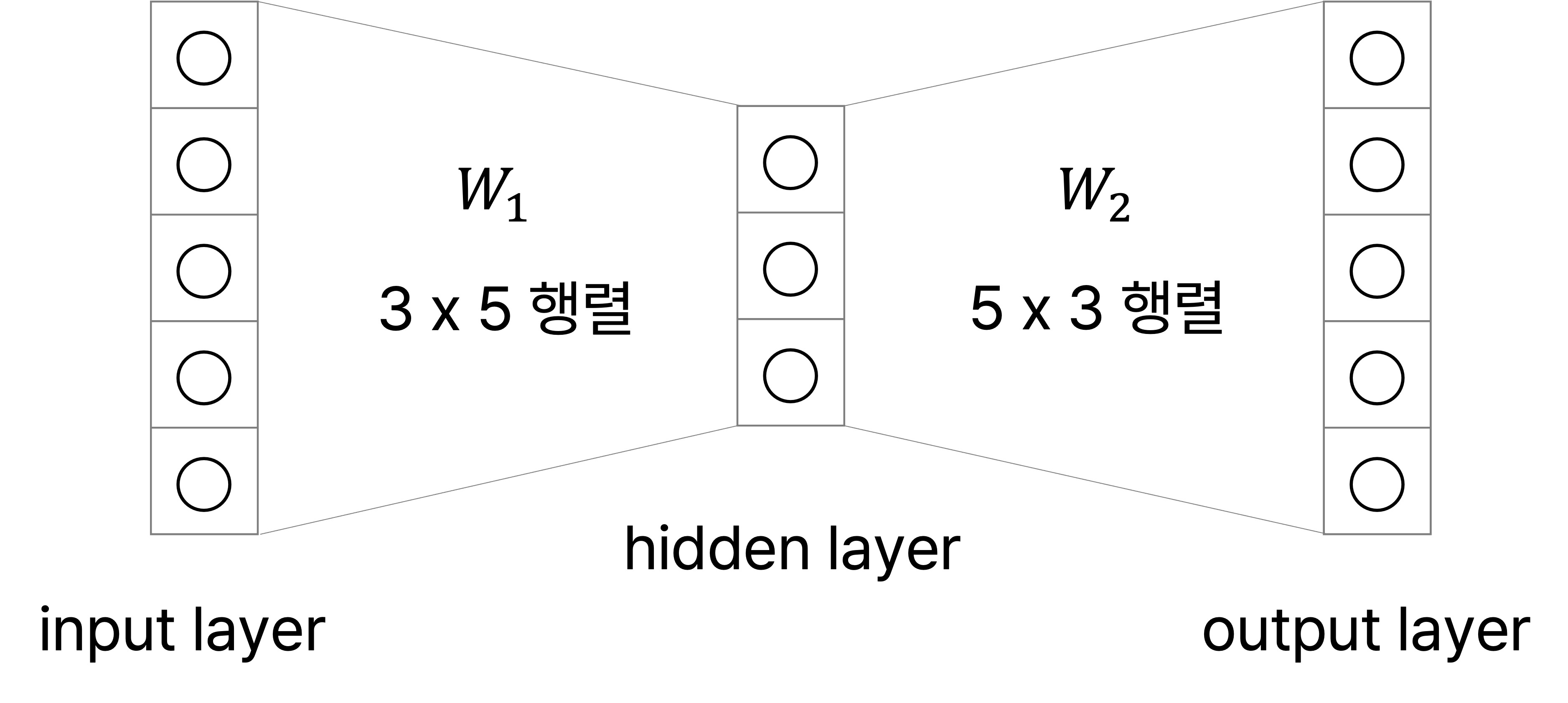 또한 각 layer 사이의 파라미터에 주목할 필요가 있다. 위의 예시에서 Input layer에서 hidden layer로 가는 파라미터를 $W_1$, hidden layer에서 output layer로 가는 파라미터를 $W_2$라고 하자. $W_1$를 행렬로 나타냈을 때의 크기는 (임베딩 차원 수) × (one-hot vector 차원 수)이고, $W_2$는 (one-hot vector 차원 수) × (임베딩 차원 수)이다.