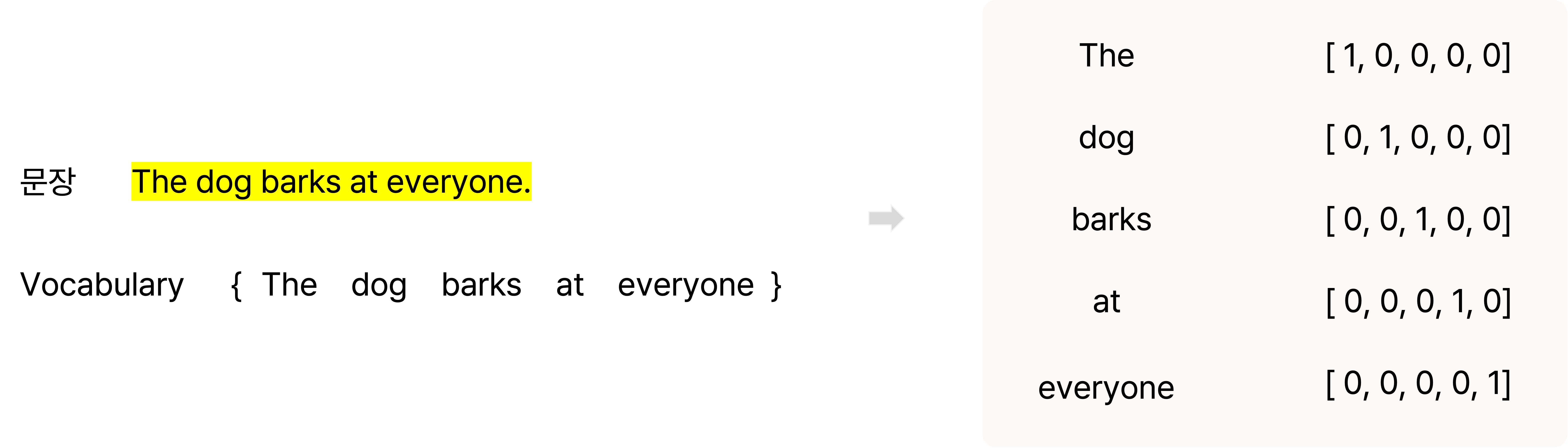 예시로, "The dog barks at everyone."이라는 문장이 주어진다고 가정해보자. 여기서 tokenizing으로 단어를 분리하면 "The", "dog", "barks", "at", "everyone"으로 될 것이다. 이 단어들을 가지고 사전을 만들었을 때, 각 단어를 one-hot vector로 나타내면 위와 같이 벡터에서 하나의 원소만 1이고 나머지는 모두 0인 원소를 갖게 된다. 위의 예시에서는 사전에 포함된 단어가 5개이므로 각 단어에 관한 벡터의 차원은 전체 단어의 개수인 5가 되고, 한 원소만 1이고 나머지 네 개의 원소는 모두 0인 one-hot vector로 표현된다.
