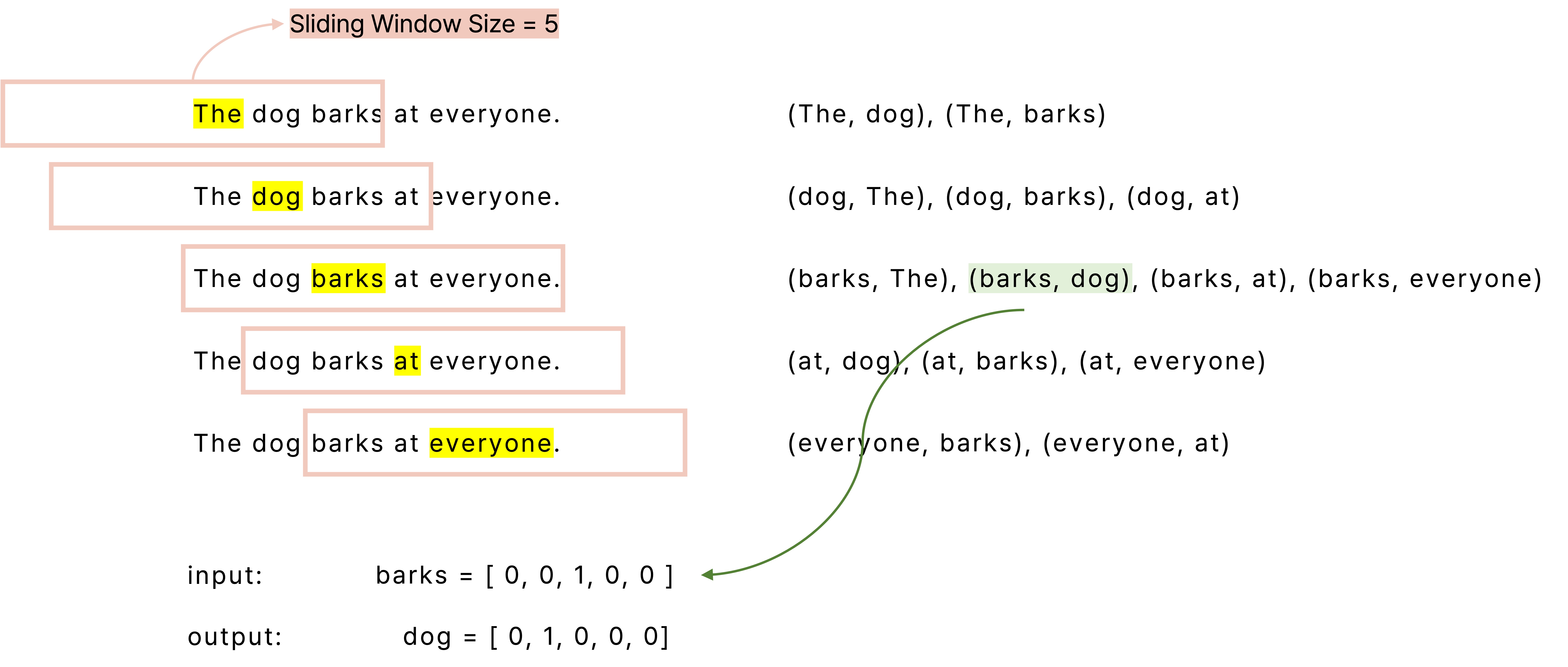다음은 Sliding window 크기를 5로 설정하여 앞서 나온 예시인 "The dog barks at everyone"를 Word2Vec으로 학습하는 과정을 정리한 것이다.