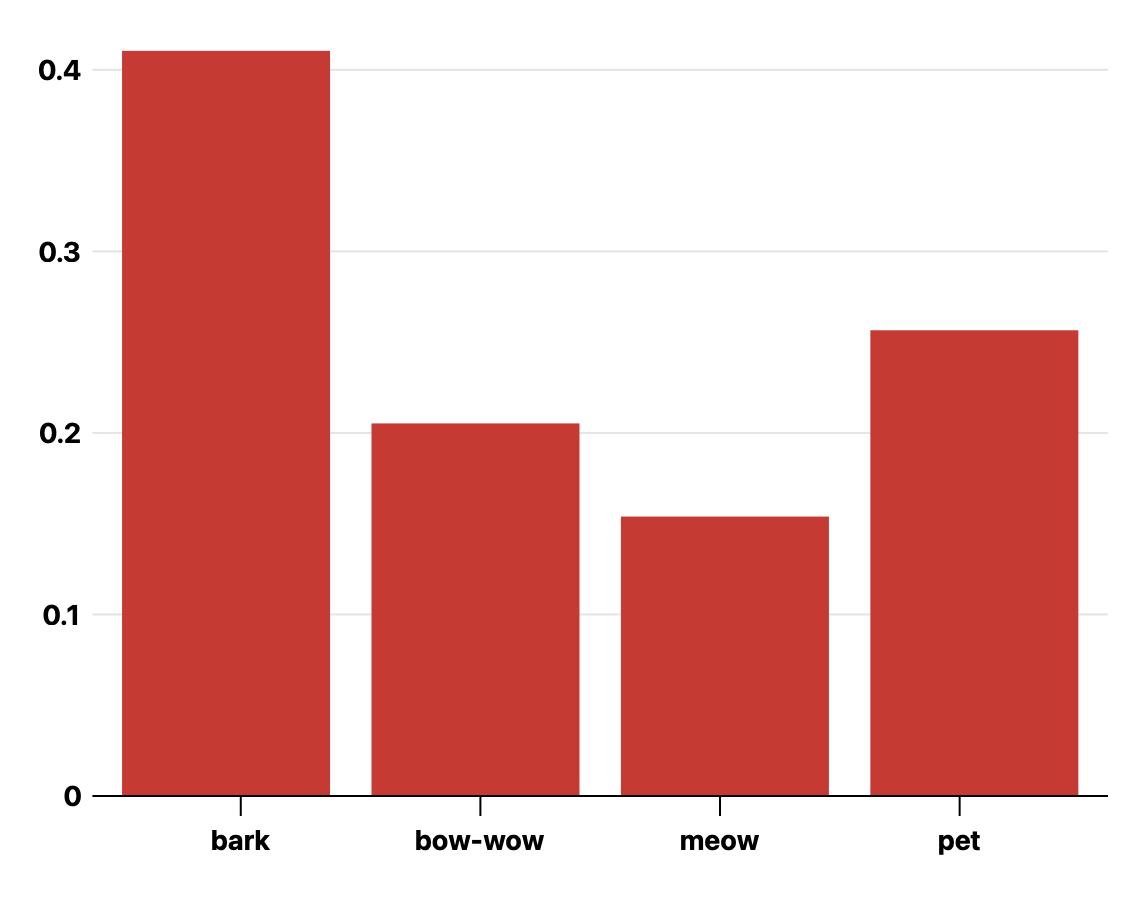 예를 들어, 'bark', 'bow-wow', 'meow', 'pet'이라는 단어 목록이 주어질 때, 각 단어에 관해 dog'라는 단어 근처에 등장할 확률 분포를 구했을 때 위와 같이 나타난다고 하자. 위의 그래프에서는 'pet'이라는 단어의 등장 확률이 가장 높게 나왔는데, 이때 'pet'과 'dog'는 유사한 의미를 지닌 단어로 해석할 수 있다.